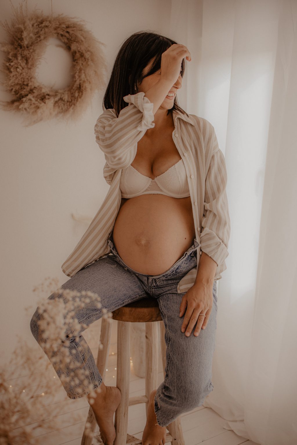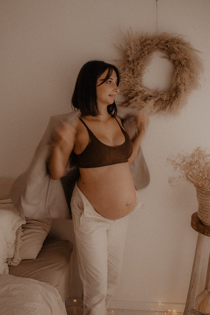 Petit conseil pour bien préparer votre séance grossesse : privilégiez des tenues aux tons neutres, doux ou naturels, qui s’accordent parfaitement avec la lumière et le décor du studio. Prévoir 2 ou 3 options vous permettra de varier les styles et de trouver celui qui vous correspond le mieux.
