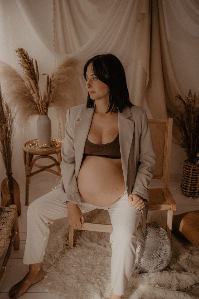 L’idée était de mettre en valeur sa féminité et sa grossesse à travers un style plus élégant et sophistiqué, avec des tenues sobres comme un blazer, dans une atmosphère chaleureuse et cosy.