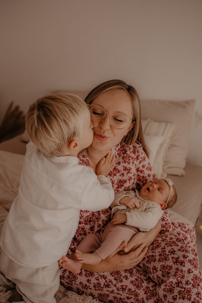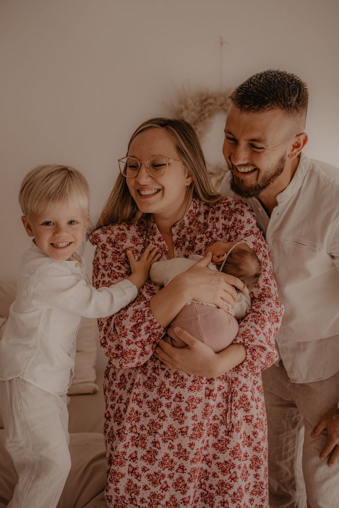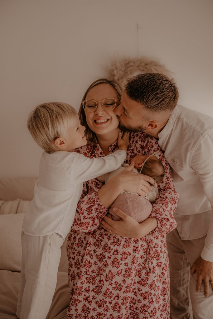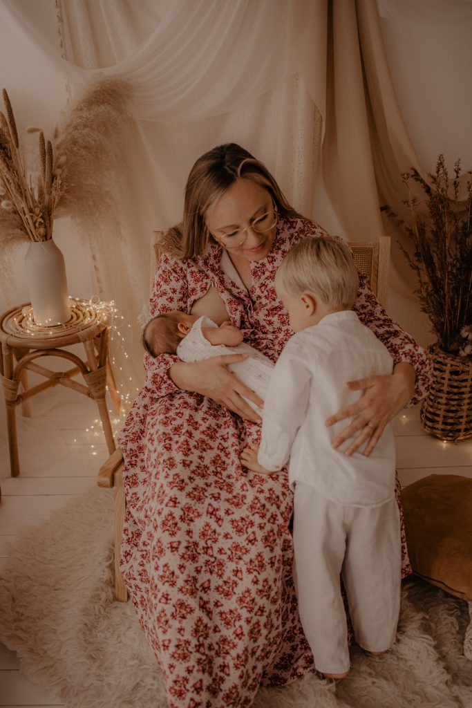 Lors de cette séance, nous avons alterné des portraits du bébé seul, des instants complices avec son grand frère, et des photos de famille complètes. Ce mélange de tendresse, de rires et de câlins raconte à merveille le début d’une belle histoire familiale.