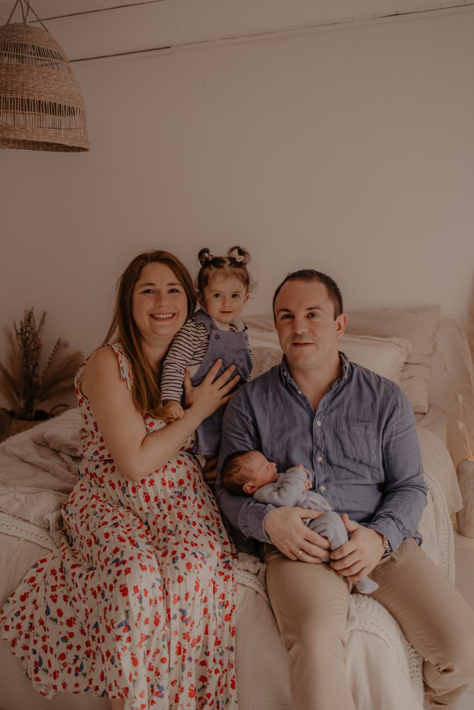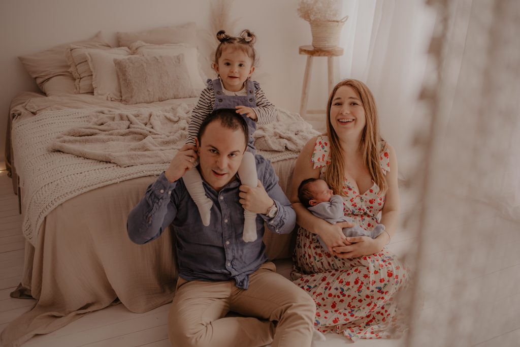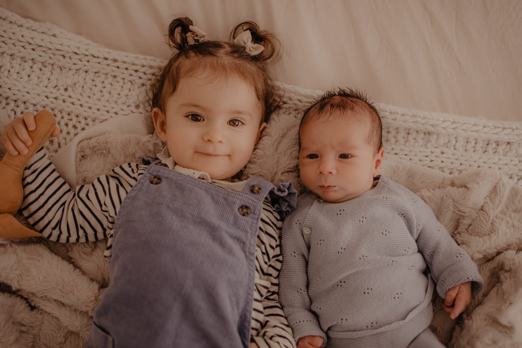 Sa grande sœur, âgée d’un peu moins de deux ans, n’était pas très motivée au début. Elle ne comprenait pas trop pourquoi elle devait faire des câlins à son petit frère. Pour l’impliquer, nous avons joué ensemble et petit à petit, la complicité est née devant l’objectif. Raphaël, lui, avait besoin de beaucoup de réconfort et passait son temps au sein. Malgré quelques pleurs, nous avons réussi à créer une atmosphère détendue, propice aux moments tendres et aux expressions naturelles.