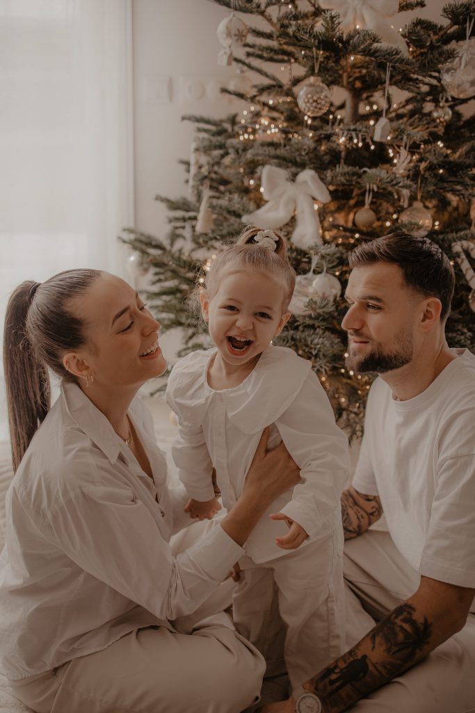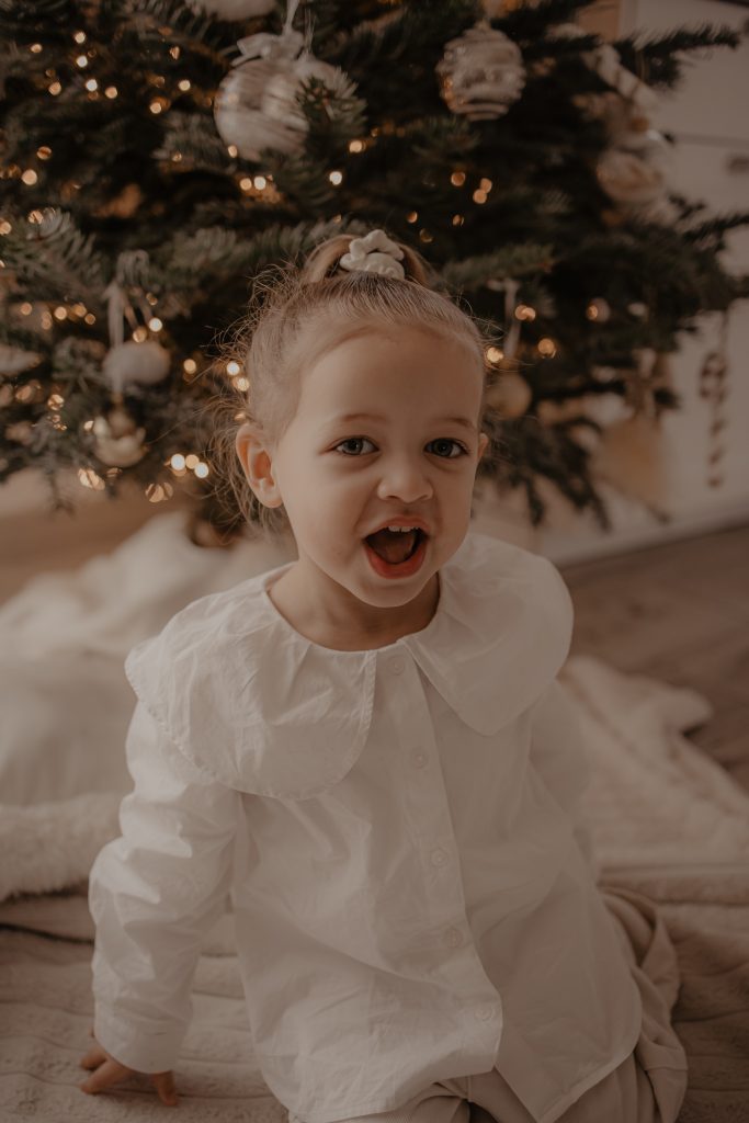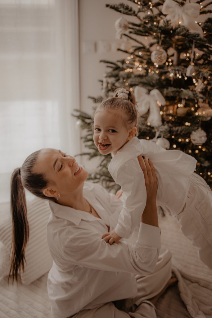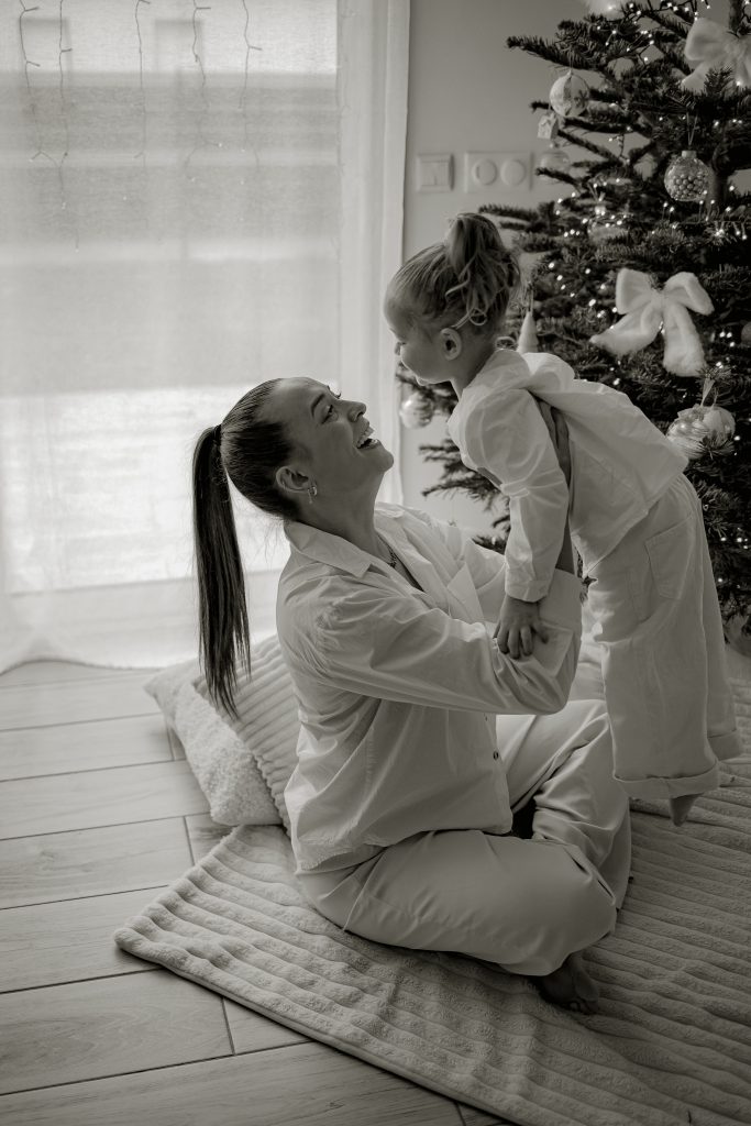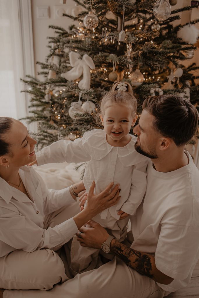 Il y a des séances qui racontent une histoire toute particulière. Celle-ci en fait clairement partie. Quelques jours avant Noël, je me suis déplacée au domicile d’une famille, pour immortaliser des moments simples et vrais : une maman, son mari, et leur petite fille de 2 ans, dans leur univers, autour du sapin, dans cette atmosphère si douce propre aux fêtes de fin d’année. Une séance photo cocooning, remplie de rires, de câlins… et de spontanéité.