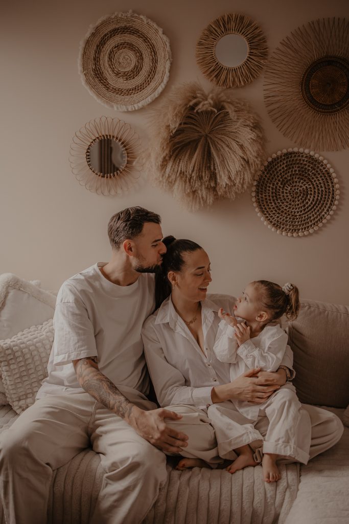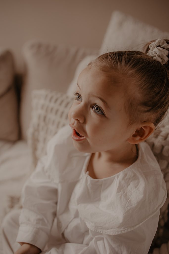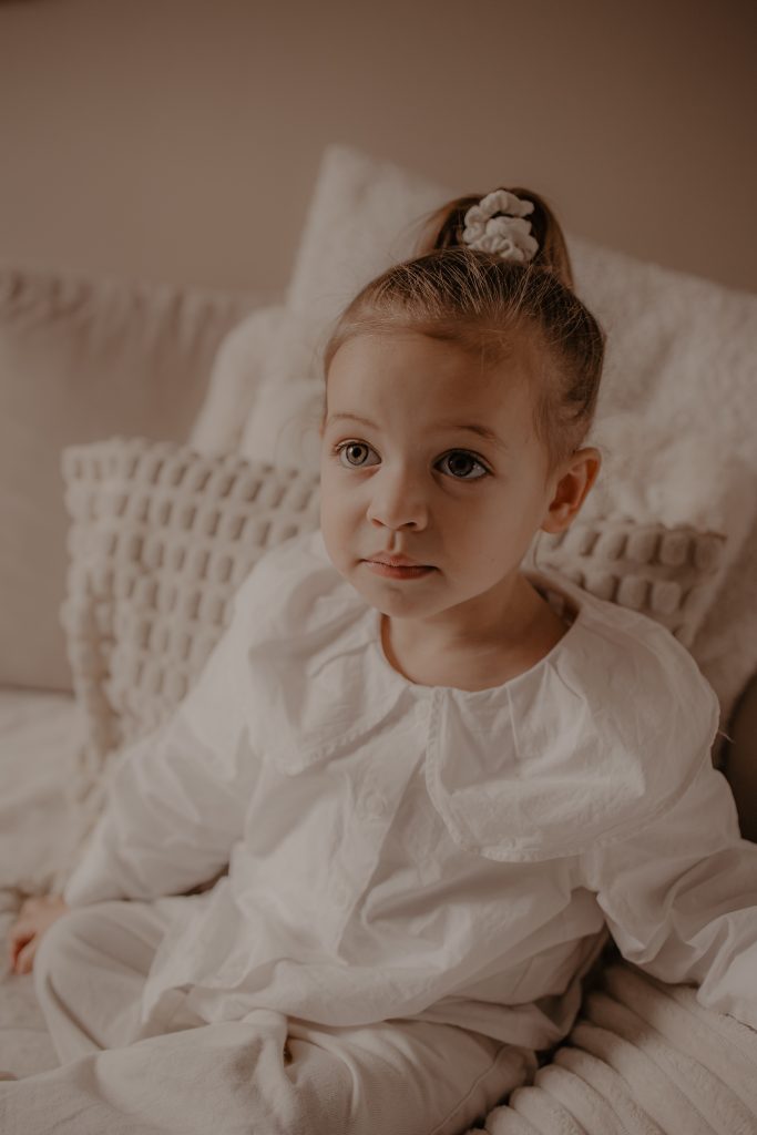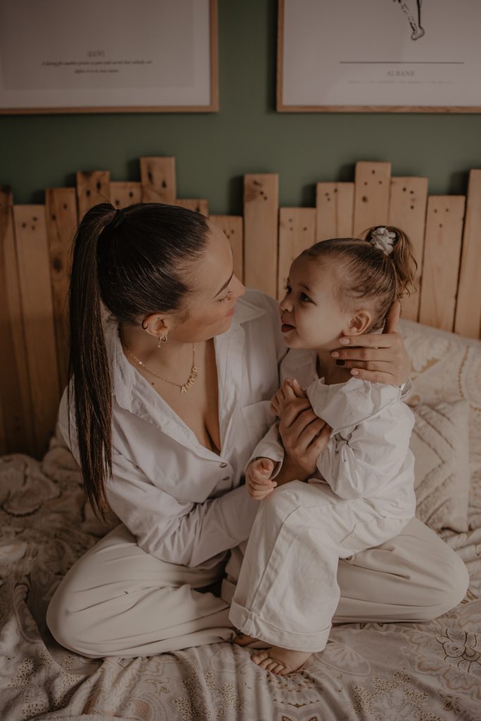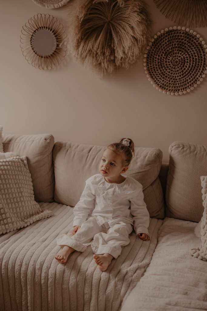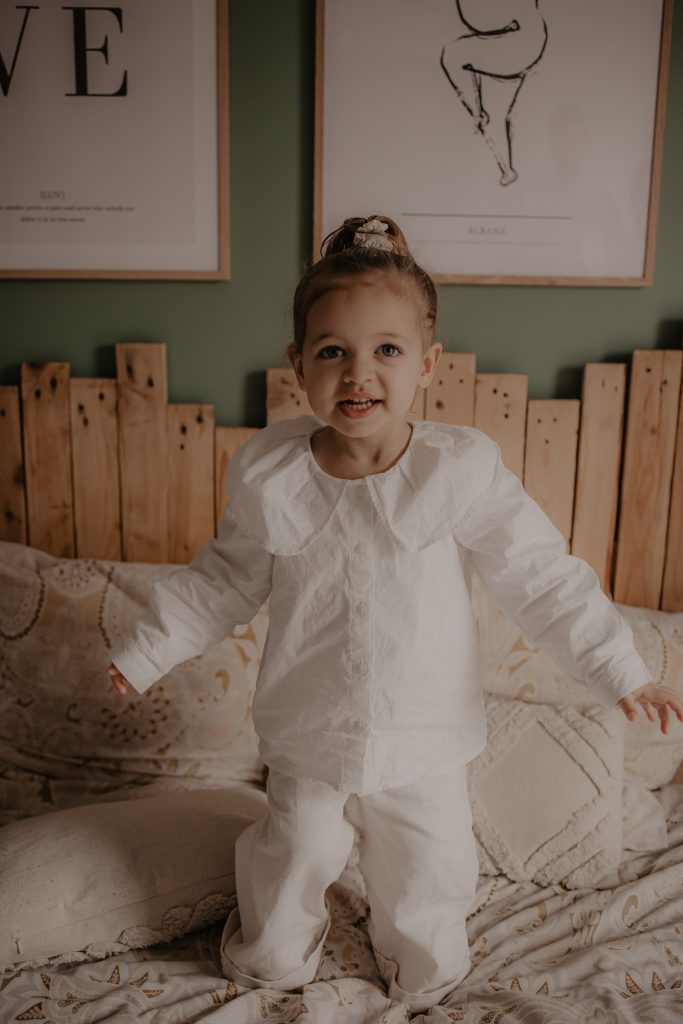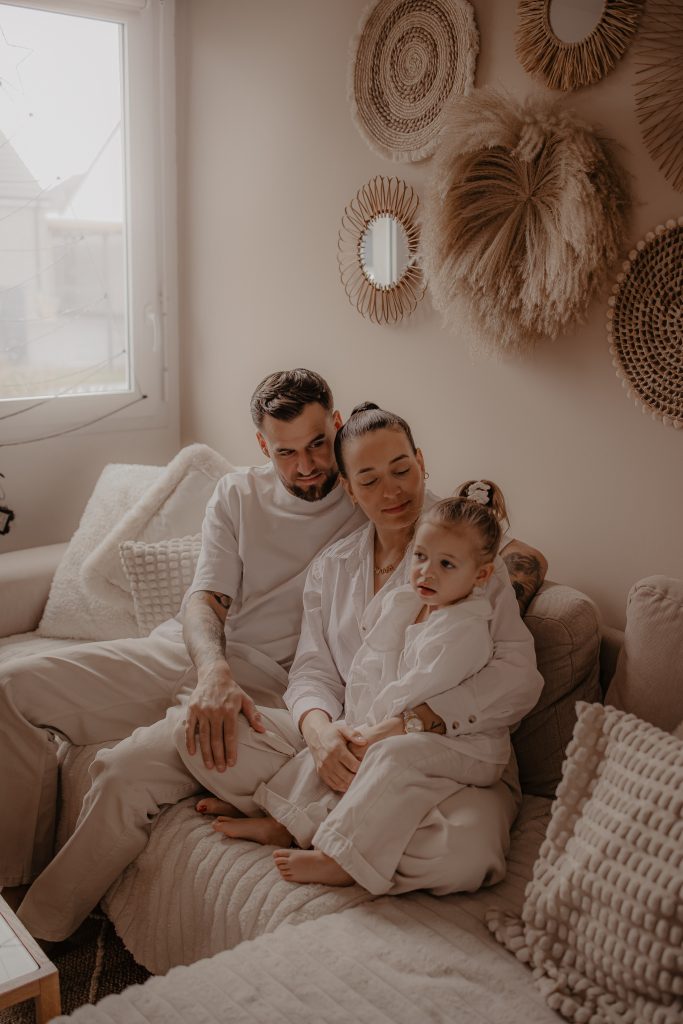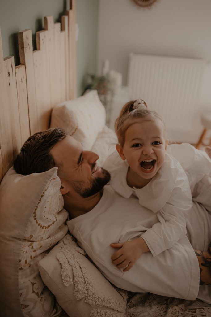 Les séances à domicile ont ce petit quelque chose en plus : on photographie la vraie vie, telle qu’elle est. Chez soi, tout devient plus naturel. Les gestes sont spontanés, les sourires sincères, les moments vrais. Pour les enfants, c’est souvent beaucoup plus rassurant. Pas de nouvel environnement à apprivoiser, pas de pression : ils jouent avec leurs jouets, se blottissent dans les bras de leurs parents, vivent leur quotidien… et moi, je capture tout ça. Pour cette petite fille de 2 ans, inutile de lui demander de “poser”. On s’est adaptés à son rythme, à ses envies (ou non-envies