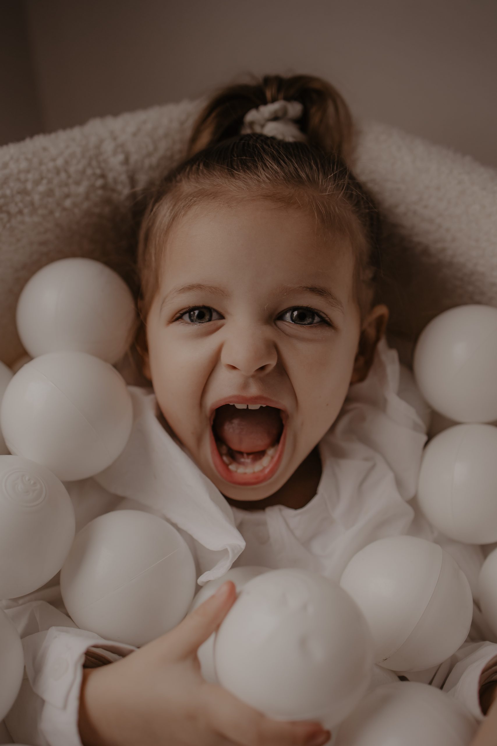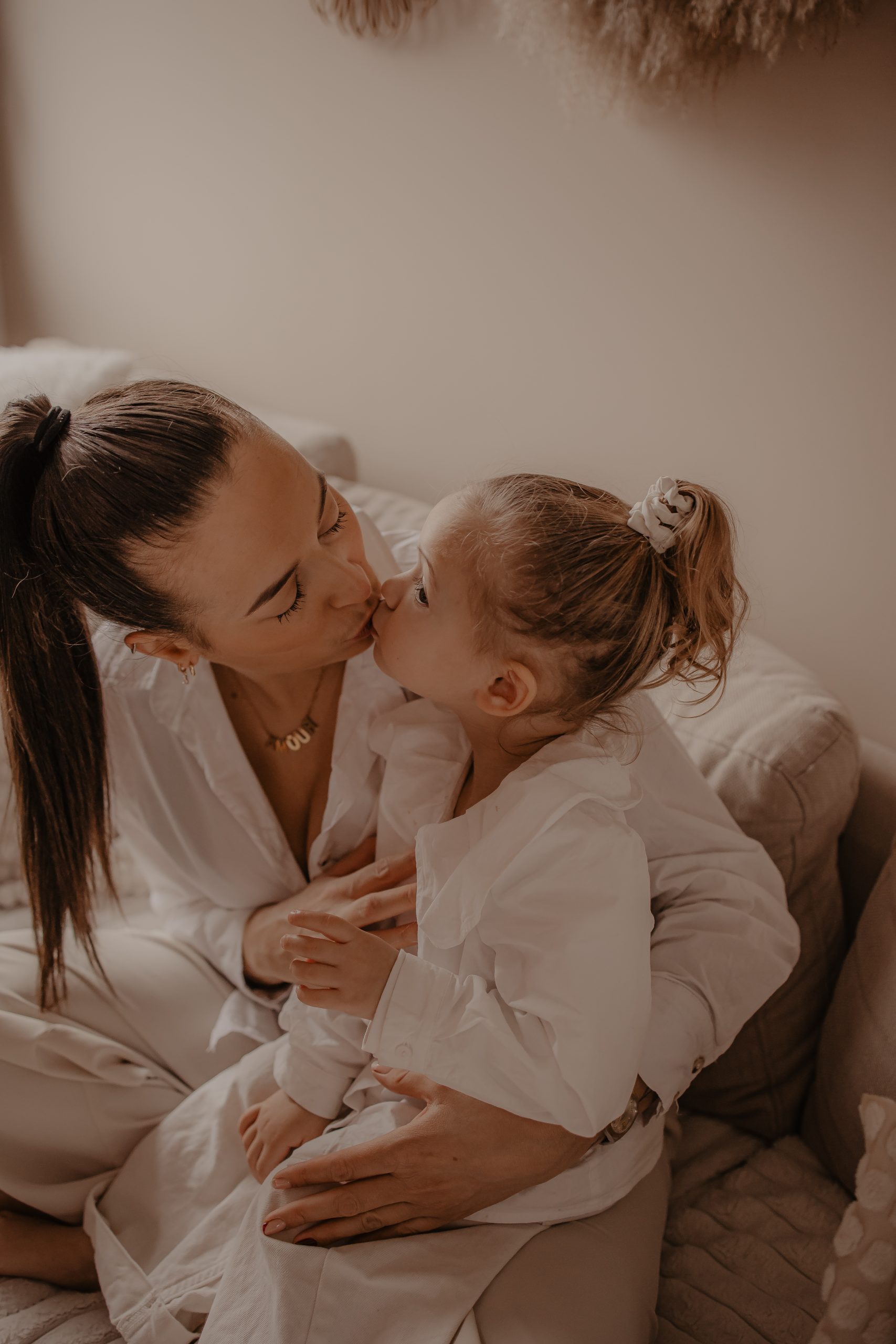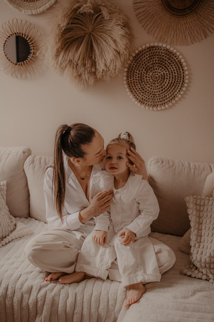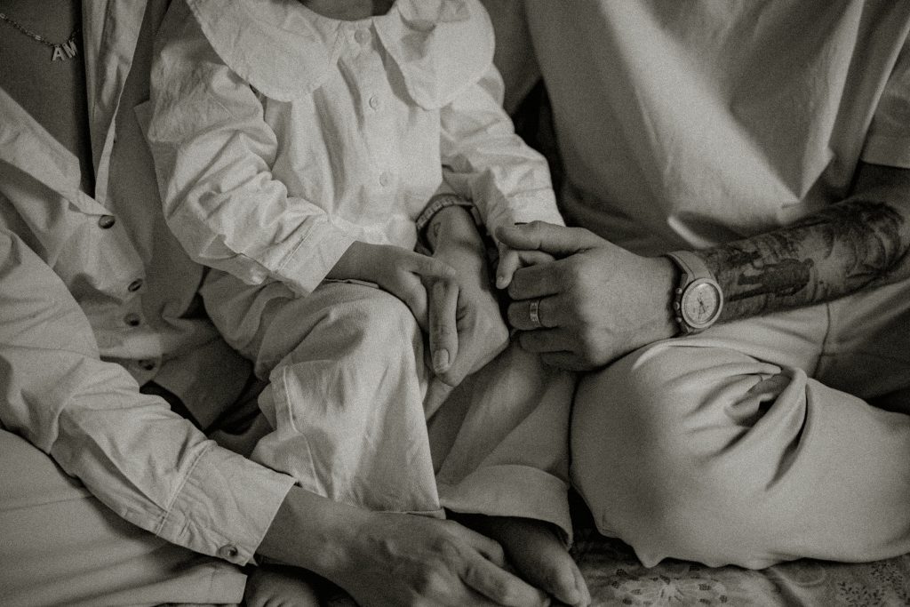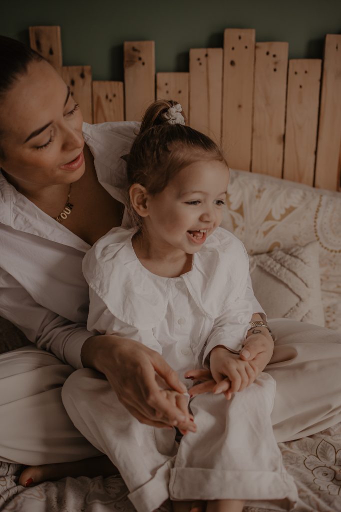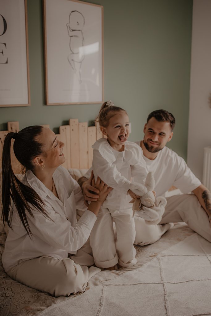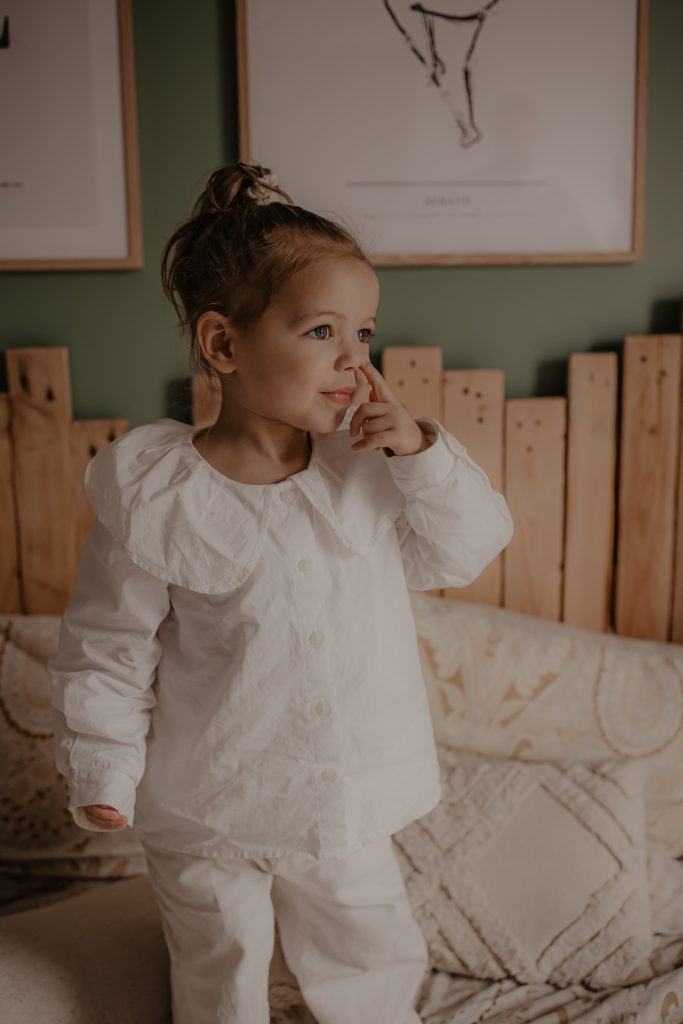 Les séances à domicile ont ce petit quelque chose en plus : on photographie la vraie vie, telle qu’elle est. Chez soi, tout devient plus naturel. Les gestes sont spontanés, les sourires sincères, les moments vrais. Pour les enfants, c’est souvent beaucoup plus rassurant. Pas de nouvel environnement à apprivoiser, pas de pression : ils jouent avec leurs jouets, se blottissent dans les bras de leurs parents, vivent leur quotidien… et moi, je capture tout ça. Pour cette petite fille de 2 ans, inutile de lui demander de “poser”. On s’est adaptés à son rythme, à ses envies (ou non-envies