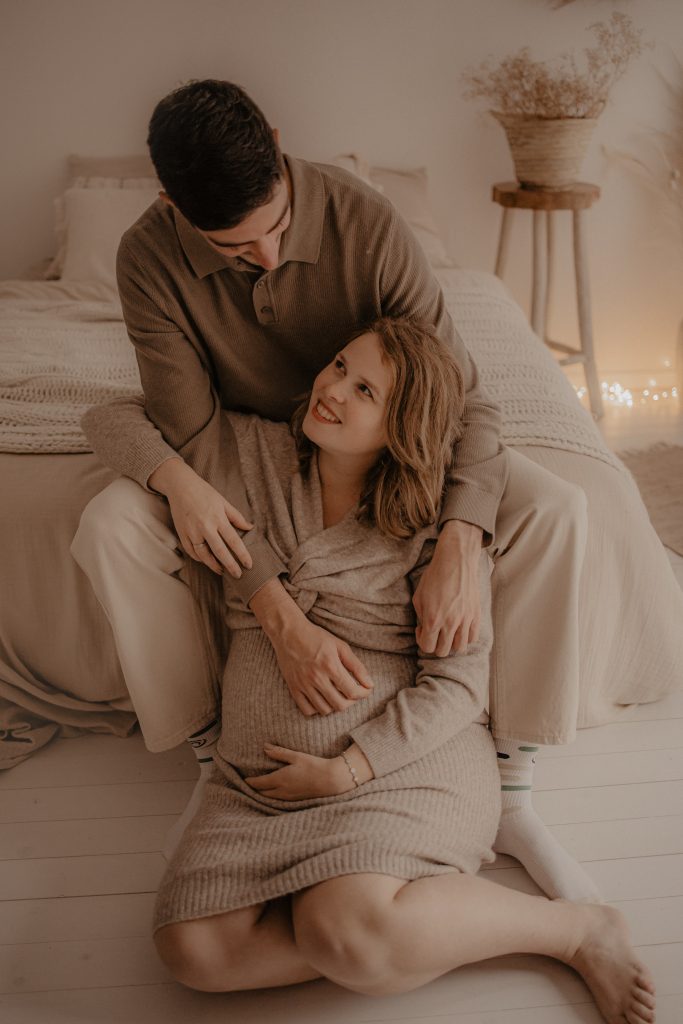 Une séance toute en douceur, dans mes teintes naturelles habituelles : beige, marron, crème… des couleurs intemporelles qui mettent en valeur la future maman et créent une ambiance chaleureuse.